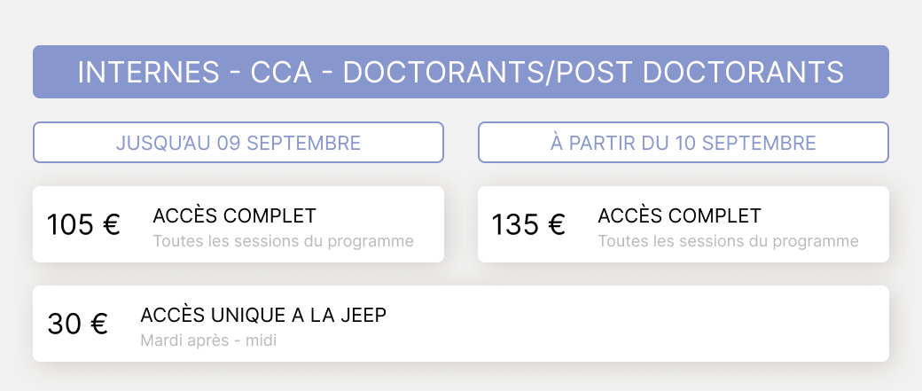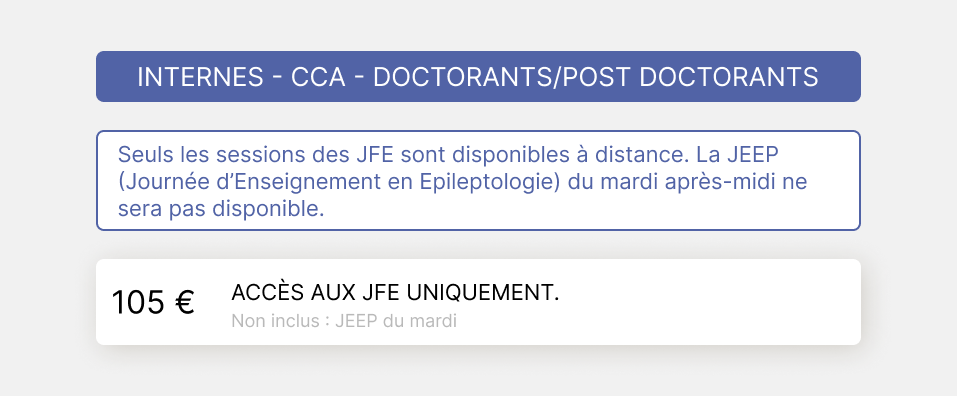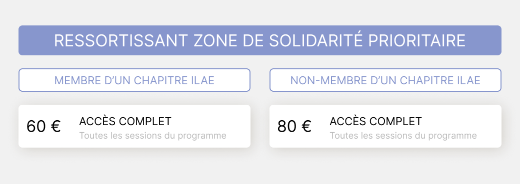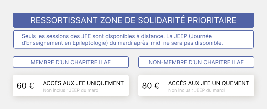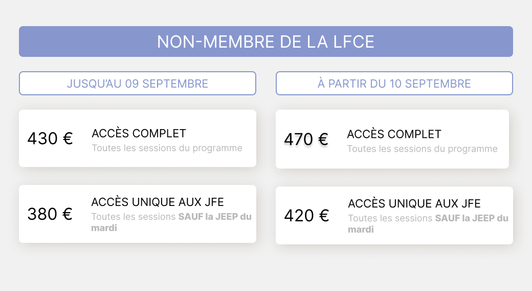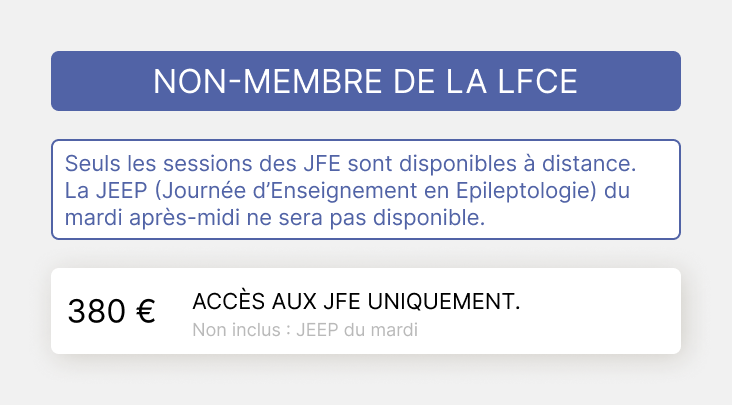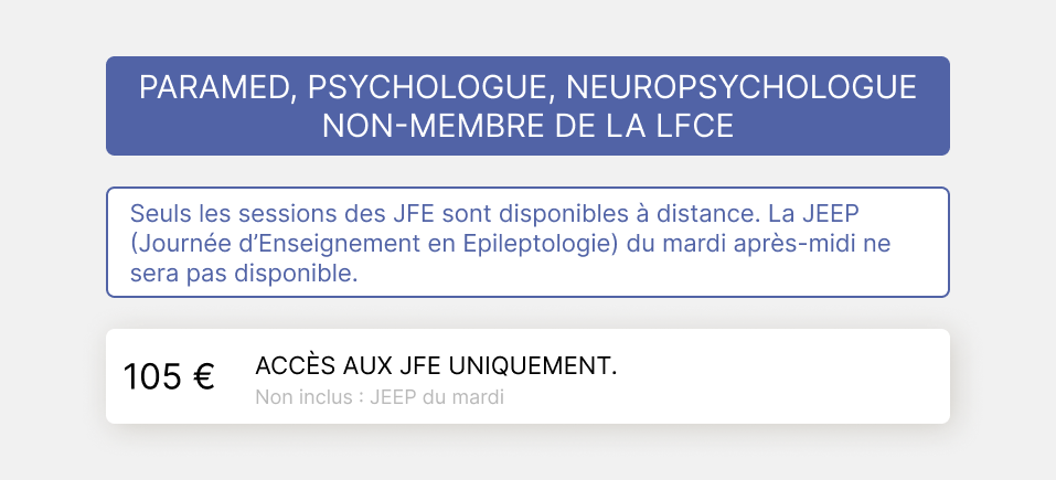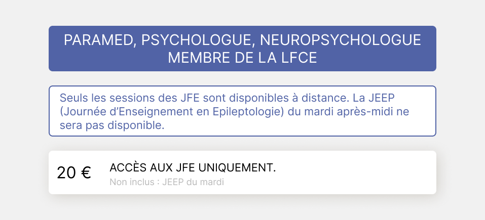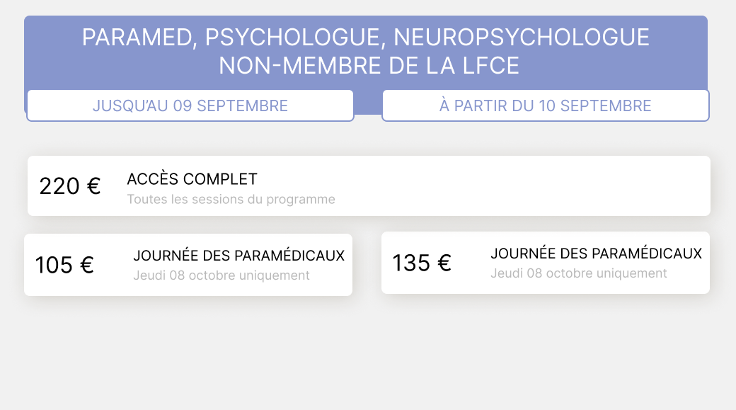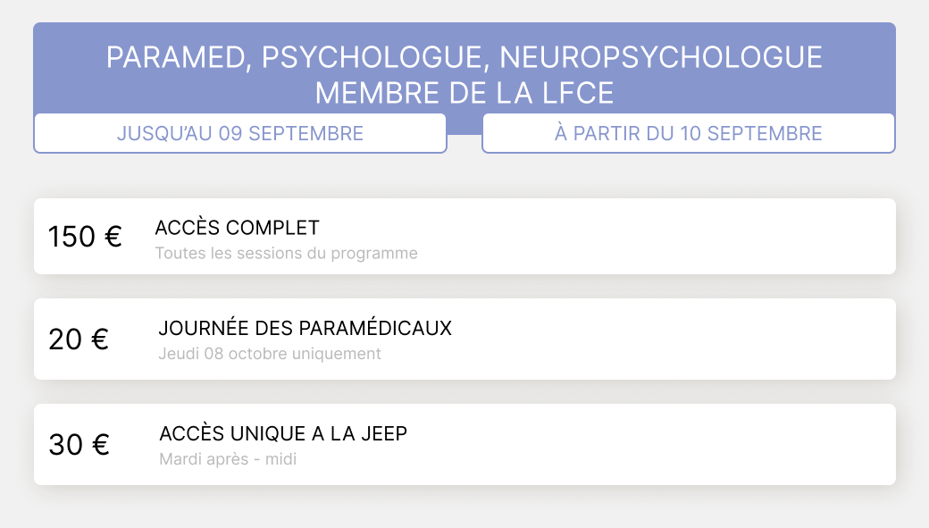 Veuillez définir votre profil. 1a MEMBRE LFCE EN PRÉSENTIEL 1b MEMBRE LFCE EN DISTANCIEL 2a NON MEMBRE LFCE EN PRÉSENTIEL 2b NON MEMBRE LFCE EN DISTANCIEL 3a INTERNE - CCA - DOCTORANT/POST DOCTORANT EN PRÉSENTIEL 3b INTERNE - CCA - DOCTORANT/POST DOCTORANT EN DISTANCIEL 4a PARAMÉDICAUX EN PRÉSENTIEL 4ater PARAMED NON MEMBRE PRESENTIEL 4b bis PARAMED NON MEMBRE DISTANCIEL 4b PARAMÉDICAUX MEMBRE EN DISTANCIEL 5a RESSORTISSANT ZPS - PRÉSENTIEL 5b RESSORTISSANT ZPS - DISTANCIEL